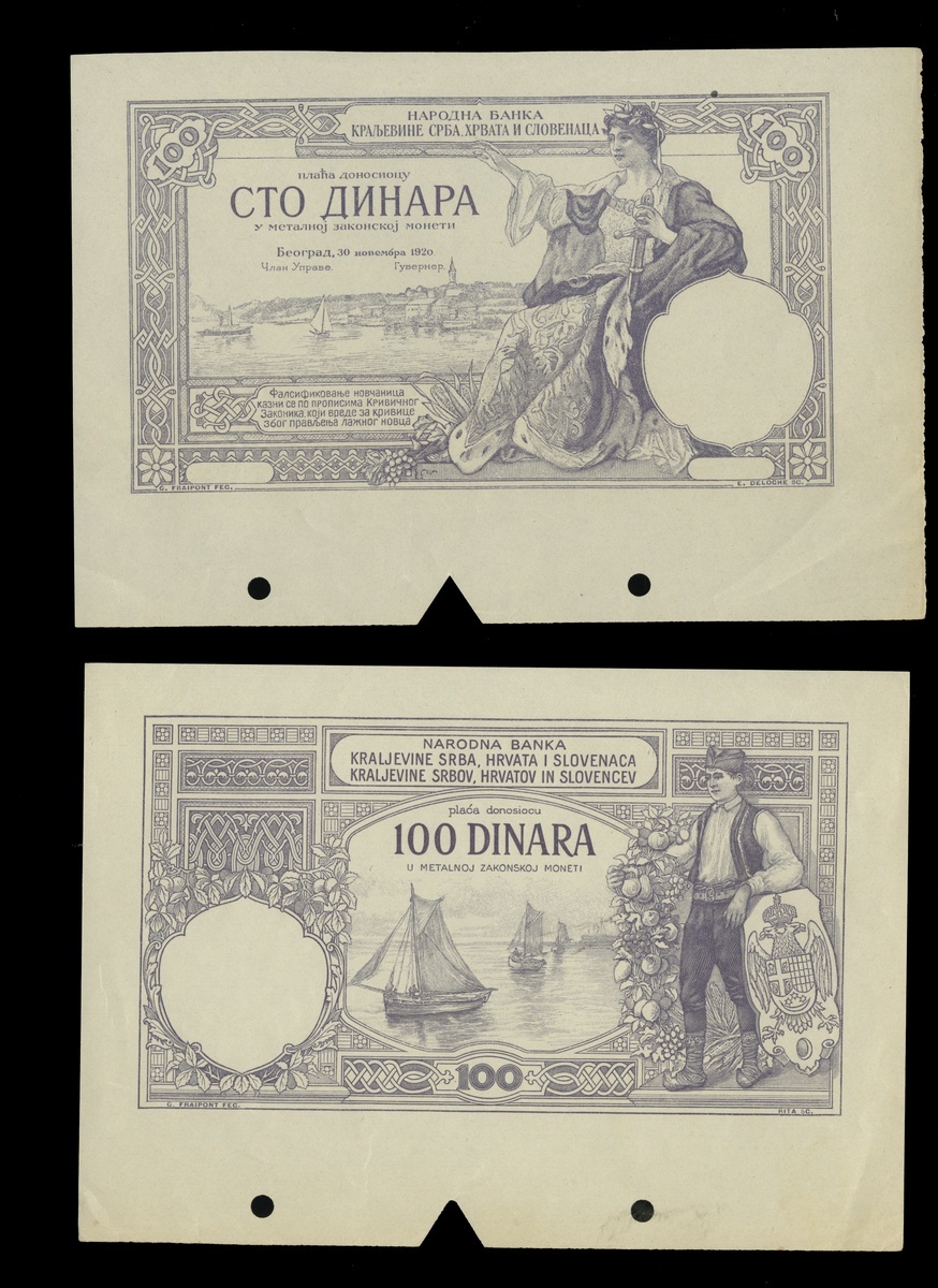 Yugoslavia. National Bank - Kingdom of Serbs, Croats and Slovenes. Front and Back Proof for 100 Dinara. 1920. P-22fp, bp. Purple. Allegorical woman seated, harbor in background; sailboats back center, man leaning on shield at right with garland of fruit. Two punch-hole cancels and single cut cancel in broad bottom margin. Extremely Fine. [2]