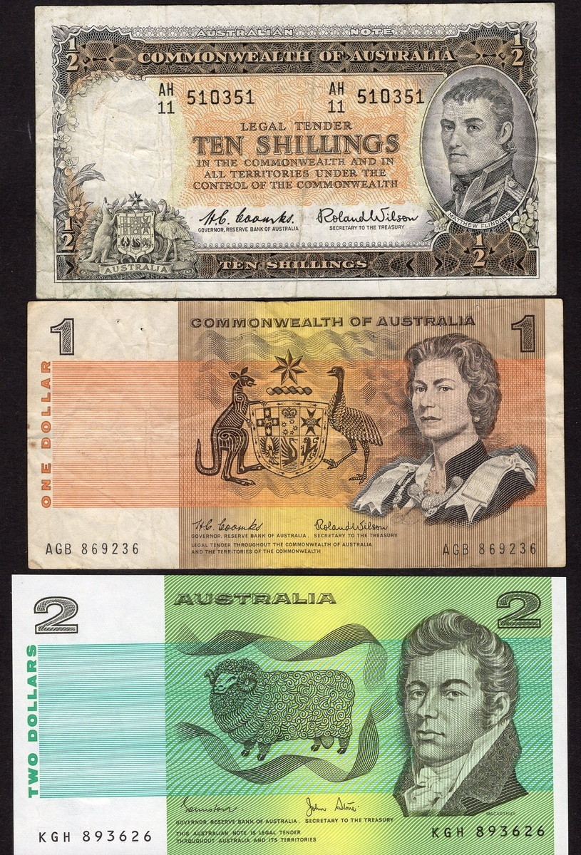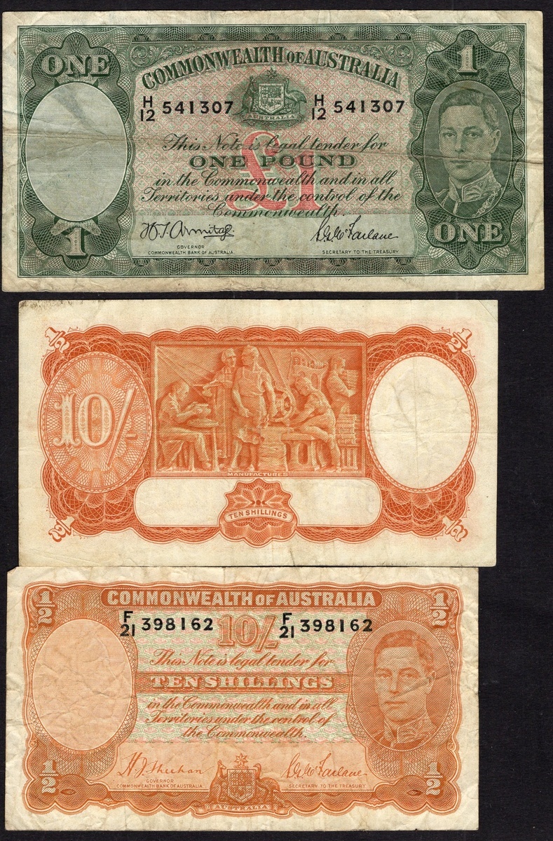 Australia and British Commonwealth Lot. Australia: P-25a (3), 26b, 33 (2) VG-Fine 37a, c (2). 42b1, c, d (2), 43c (3), d (3), e, 51 (2), 52a, b, 56. Fine-Uncirculated; India. P-18b. Fine; Ceylon. P-34; Trinidad & Tobago. P-5b. Both with tape residue, VF; Great Britain. P-368. About VG-VG; St. Helena. P-5. Uncirculated; Barbados. P-32. F-VF; Belize. P-53b. Fine; and Cayman Islands. P-5f. VF.