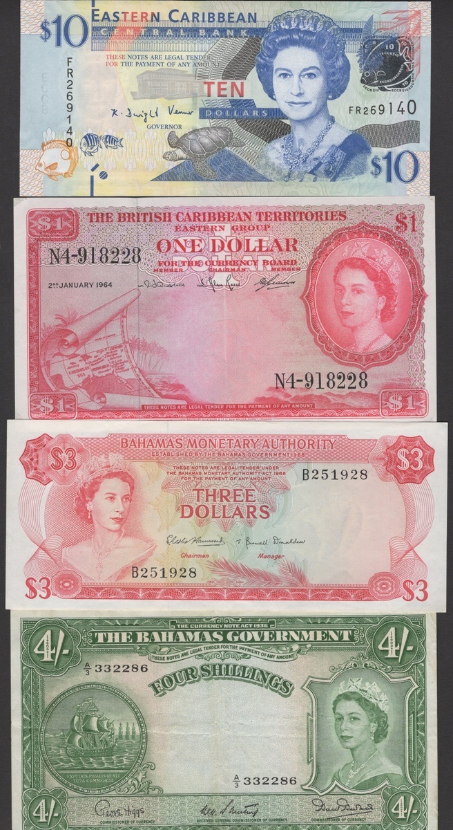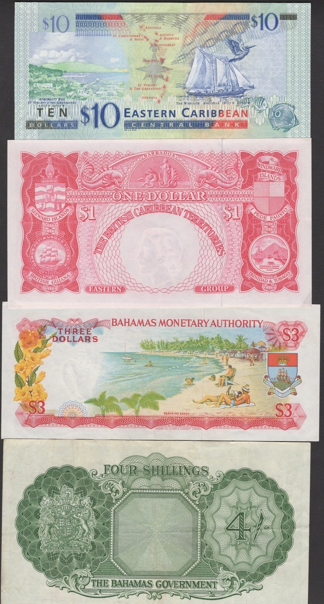 British Caribbean Group. Bahamas. 4 Shillings. P-13b, 3 Dollars. P-28a; British Caribbean Territories. 1 Dollar. 2 January 1964. P-7c; and Eastern Caribbean States. 10 Dollars. P-52. The last AU, the others Very Fine. [4]