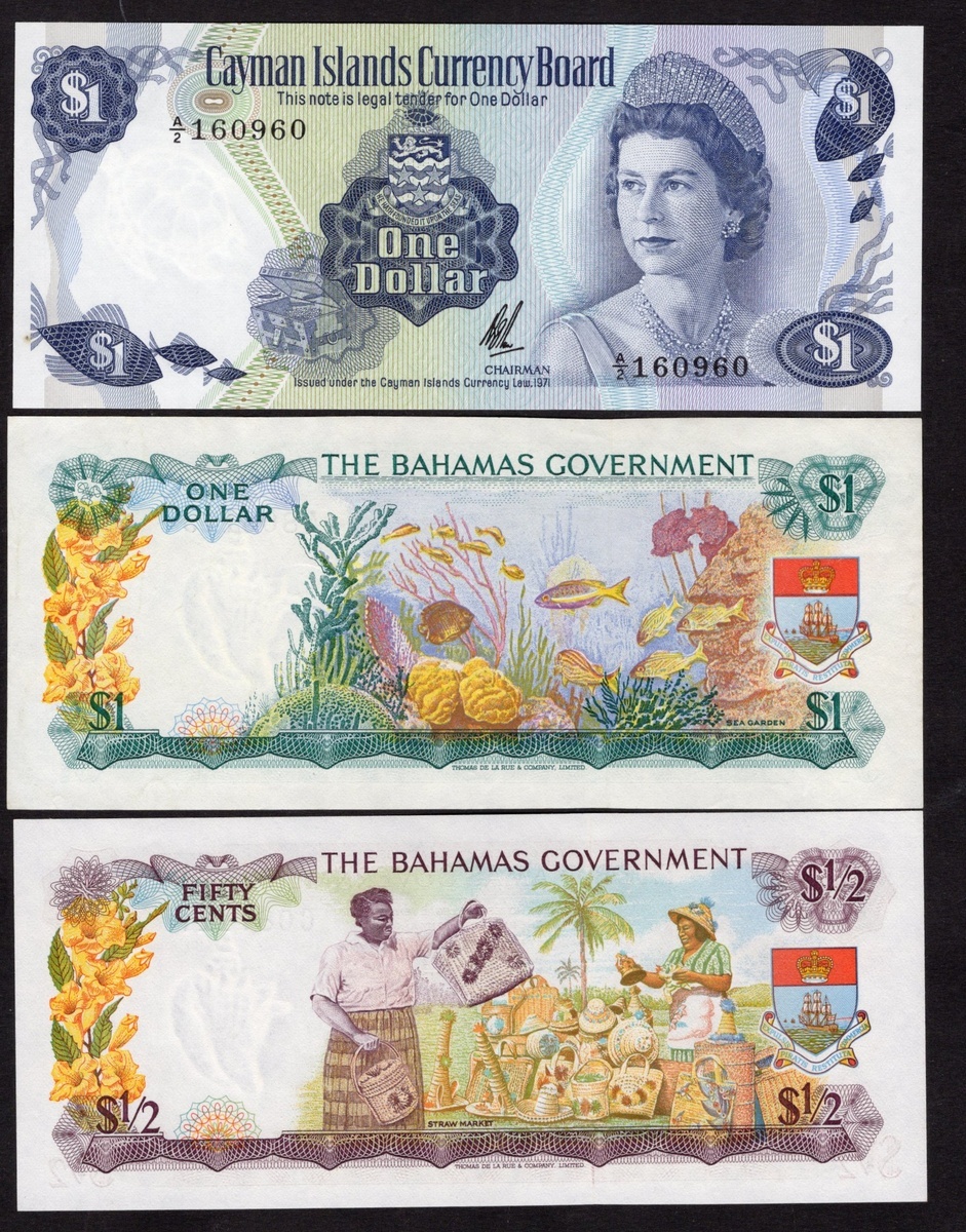 British Caribbean Lot. Includes: Bahamas. Bahamas Government. ½ Dollar and 1 Dollar. P-17a, 18a; Central Bank of the Bahamas. 1 Dollar. P-35b. Queen Elizabeth II at left; and Cayman Islands. Cayman Islands Currency Board. P-1b (2). Queen Elizabeth II at right. Uncirculated. [5]