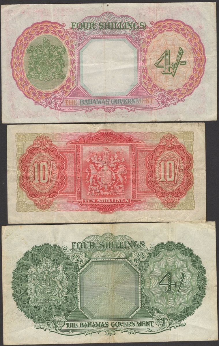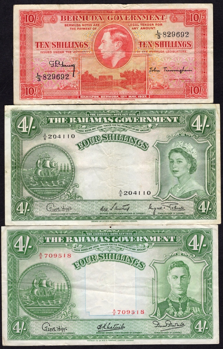 British West Indies and western Atlantic lot. Includes: Bahamas 4 Shillings (2). Law 1936; (1953). P-9e, 13d. George VI; Elizabeth II portrait at right. Both Good Fine with snap, the first pinhole; Barbados. 1 Dollar 1st June 1943. P-2b. George VI at right. Nibbling top margin, Fine-About VF; Bermuda. 10 Shillings. 1937. P-10b. George VI at center, Gate's Fort below. Good Fine; and British Guiana. 1 Dollar. 1938. P-12b. Kaieteur Falls at center, toucan left. Fine. [5]