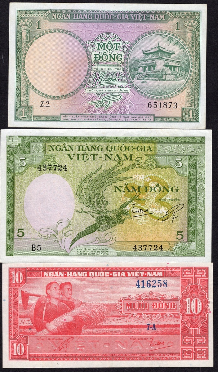 South Vietnam and Vietnam Lot. South Vietnam: P-1 (4), 2 (2), 5, 6 (2), 8, 15 (5), 16 (2), 17 (4), 18 (10), 22 (3), 23 (3), 24 (4), 25 (2), 34; Central Committee-NFLSV. P-R3, R7Vietnam. P-86 (3), 97, P-100 (9), 101 (9), 105, 107 (2). The Pick 22 VG-Fine, the P-R7 Fine with some stains; the rest Fine-Uncirculated.
