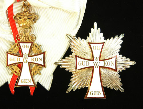Denmark, Kingdom, Order of the Dannebrog (Dannebrogordenen), F.IX.R. (1947-72), Grand Cross set of Insignia, by Michelsen, Copenhagen, sash Badge, 86mm including crown suspension x 41mm, silver-gilt and enamel; Star, 85mm, silver, silver-gilt, and enamel, with silver mark and maker´s mark on reverse, extremely fine, with full sash riband and lapel rosette, in case of issue, together with Bestowal Document named to His Excellency Monsieur Maurice Couve de Murville, Minister of Foreign Affairs, and dated 3.6.1965 (2) Estimate £ 550-600