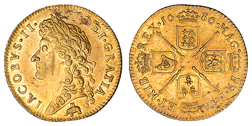 James II, Guinea, 1686, second bust, elephant and castle below, rev. four crowned shields cruciform (MCE 127; S.3403), toned, flecking above bust, weak on French shield, much mint bloom, a most pleasing example, extremely fine Estimate £ 4,500-5,500 provenance Bt. Seaby, 18 November 1955, £18-10-0.