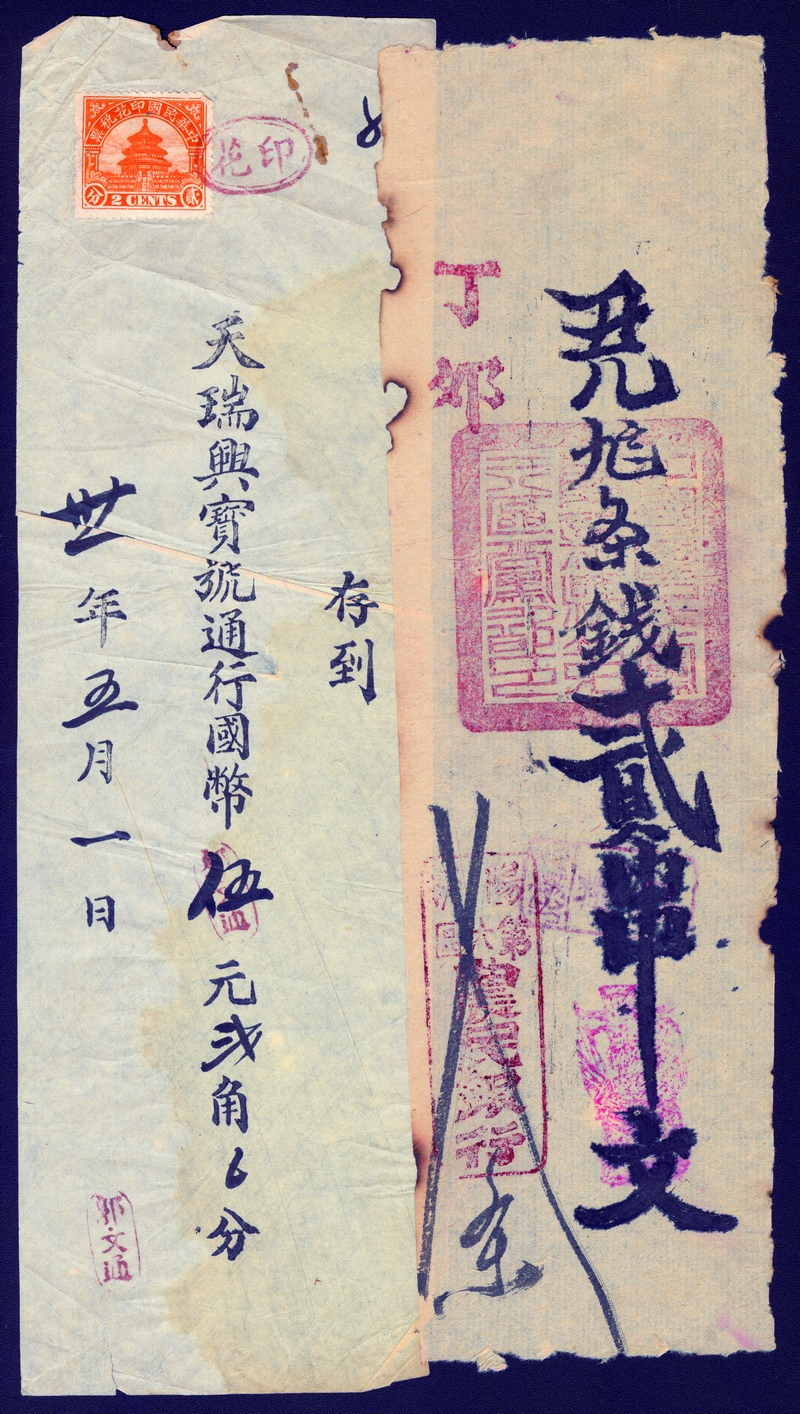 1927-42 Republic Period, group of two deposit slips, 1942 example franked with revenue stamp, fine.