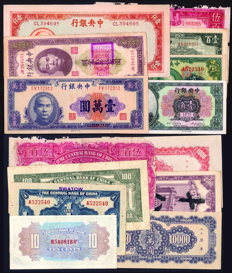 1930-40's Central Bank of China, group of 7, including 10c, 1 Yuan, 100 Yuan, 500 Yuan, 1000 Yuan, 10000 Yuan & 2500 gold units, F-AU (7).