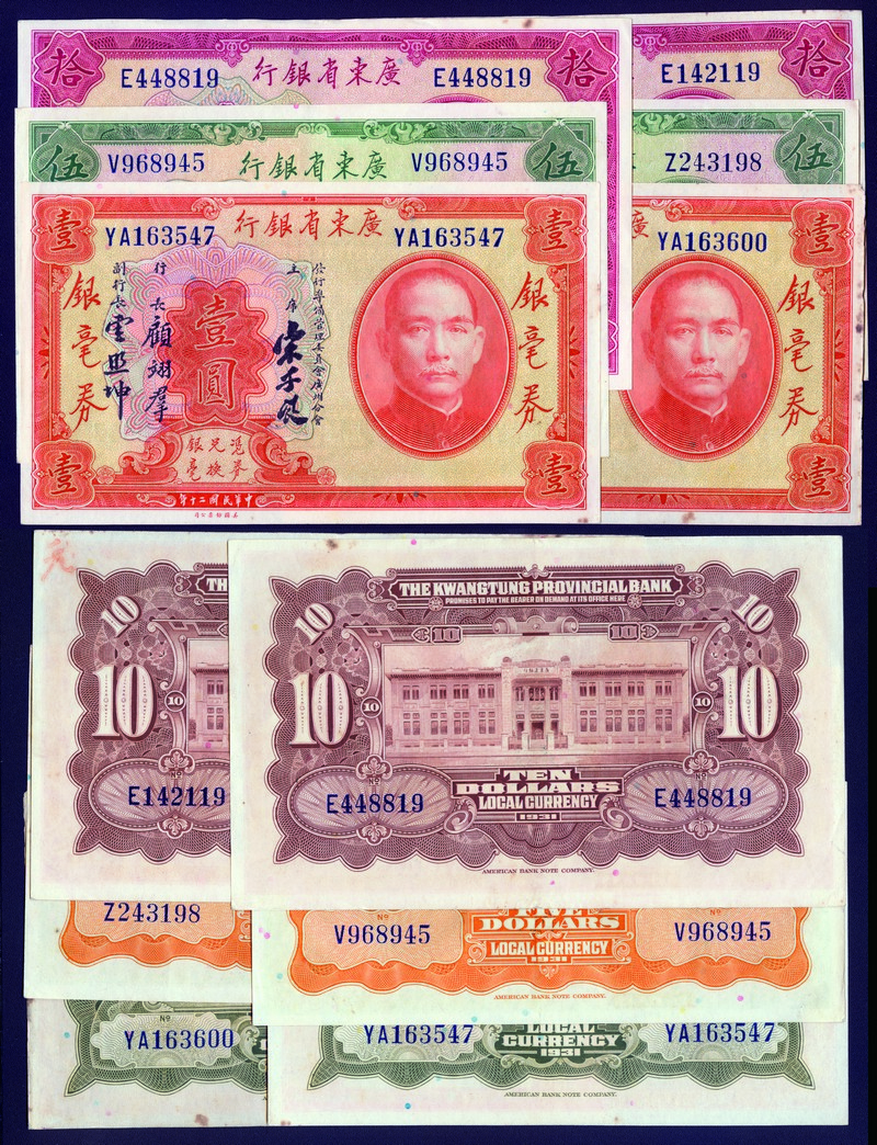 1931 Kwangtung Provincial Bank $1, $5 & $10, two sets, EF-AU (6).