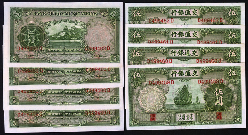 1935 Bank of Communications 5 Yuan, group of 4 with consecutive serial numbers D499459D-D499462D, UNC (4).