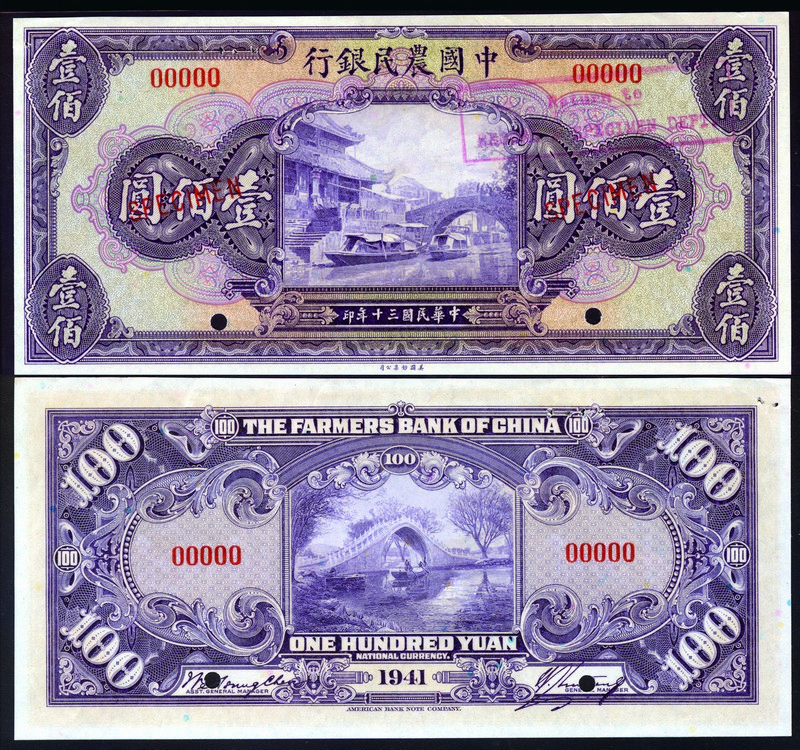 1941 The Farmers Bank of China 100 Yuan, red "Specimen" overprints with two security punch holes at bottom, PMG 64.