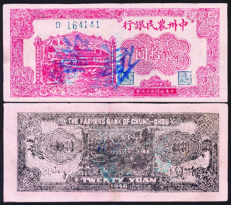1946 The Farmers Bank of Chung-Chou 20 Yuan, with "Counterfeit" (Chinese characters) handstamp, an old imitation.