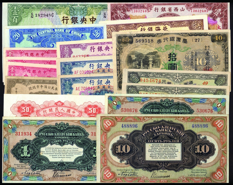 China Accumulation, group of 17 notes and one proof, including Russo-Asiatic Bank, Central Bank of China, Fengtien Public Exchange Bank, Bank of Bai Hai, Central Bank of Manchukuo, Bank of Taiwan, etc, need to examine (18).