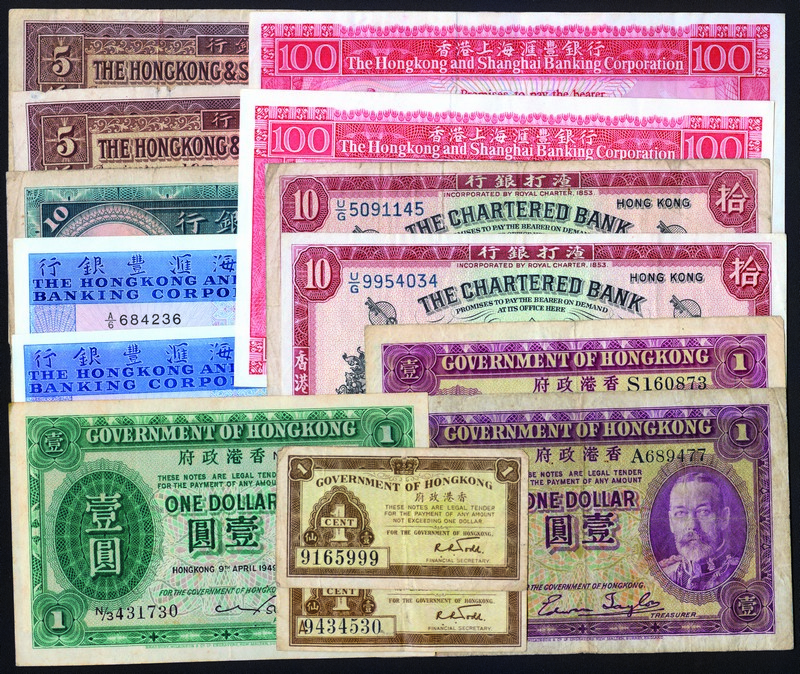 Hong Kong Accumulation, group of 14 notes, including Government of Hong Kong 1c(2) & $1(3), 1941 HSBC $10 & 1946 $5(2), 1977 & 1982 $100, 1983 $50(2), Chartered Bank undated $10(2), F-VF.
