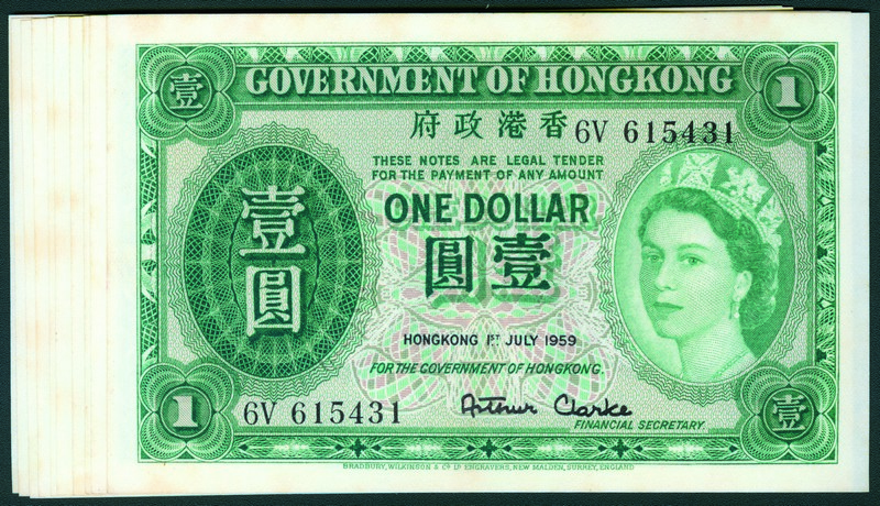 1959 (July 1) Government of Hongkong $1 (Ma G14), group of 10 with consecutive serial numbers, 6V 615431-615440, UNC.