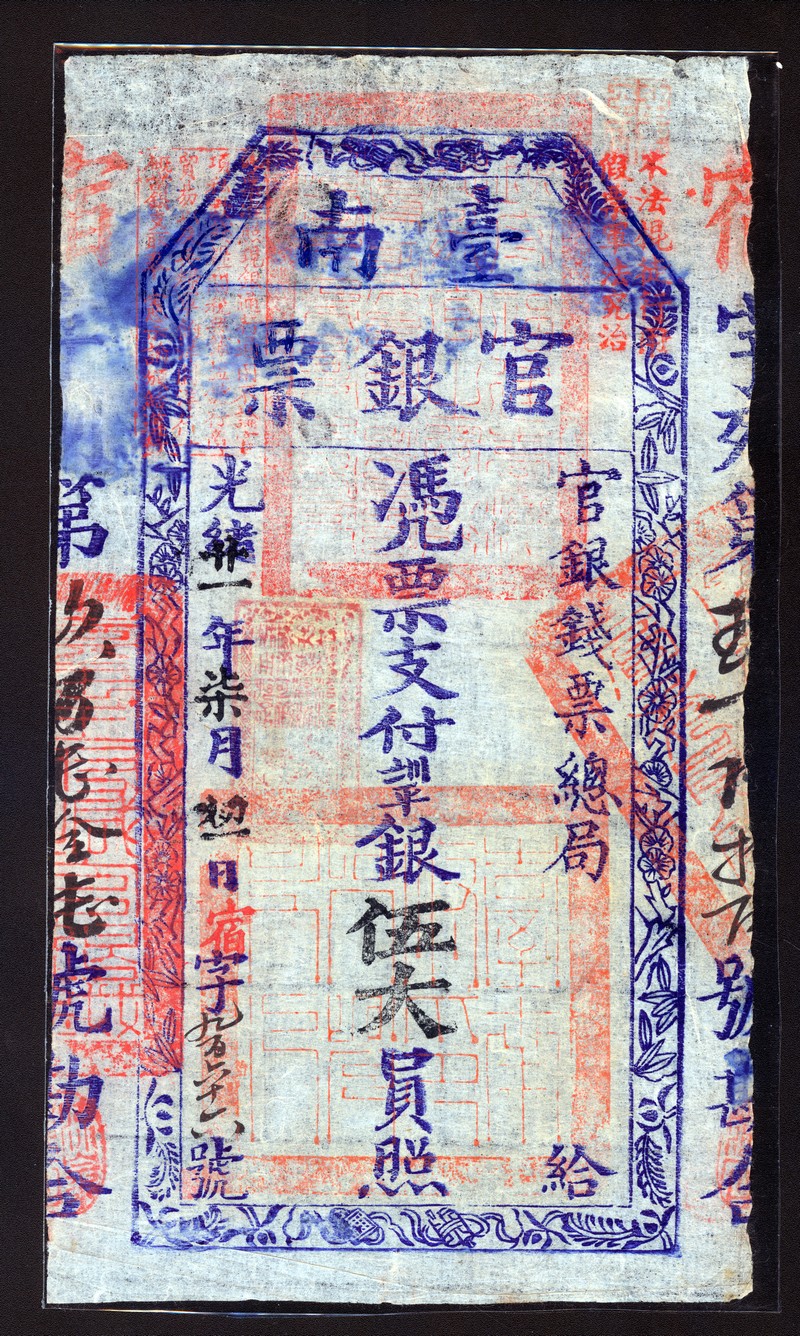 1895 Tainan Official Silver Note 5 Yuan, printed in blue and white, bearing various red seals, very fine.