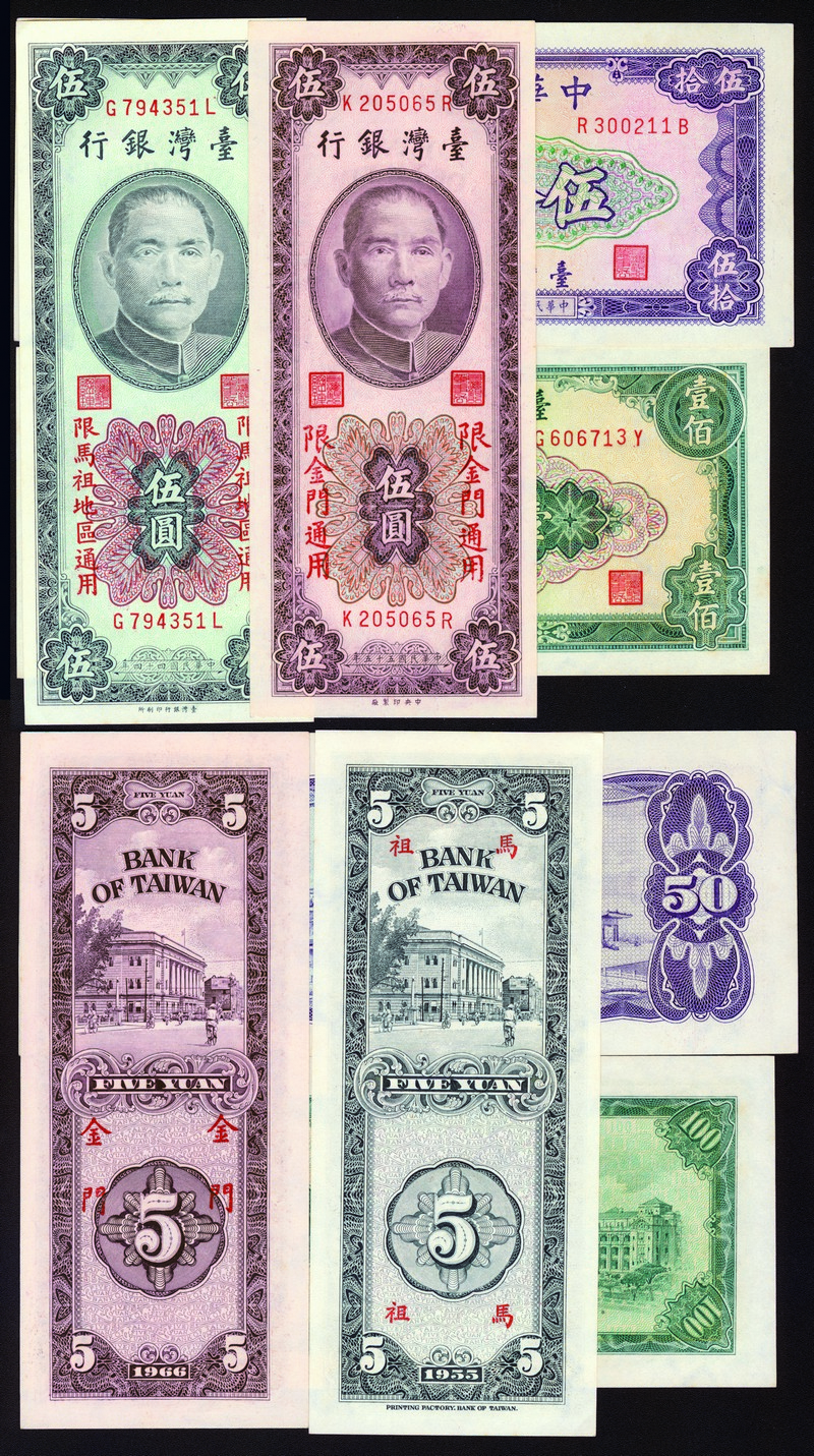 1955-70 Bank of Taiwan, group of 4, including 1955 5 Yuan, 1964 100 Yuan, 1966 5 Yuan & 1970 50 Yuan, AU-UNC (4).