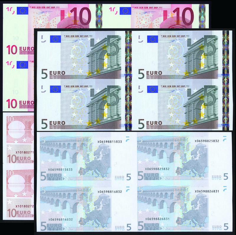EU: 2002 Euro 5 & Euro 10, two values in uncut sheets of four banknotes, extremely scarce uncut Euro notes, presented only to VIP customers, very sought after collector's items, rarely offered in public auctions, UNC.
