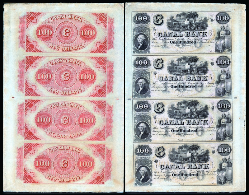 USA: 1860's Canal Bank $100, uncut sheet of 4 notes, very fine.