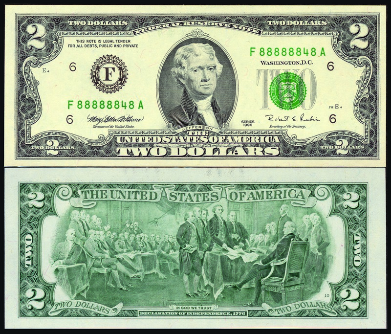 USA: 1995 $2 Legal Tender Note, serial number F88888848A, Gem UNC.