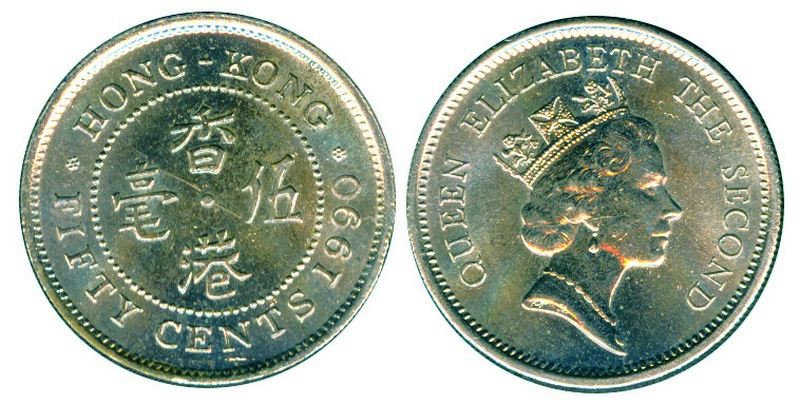 1990 Hong Kong QEII 50c Nickel-Brass (Ma C39var), wrong material used error, scarce, UNC.