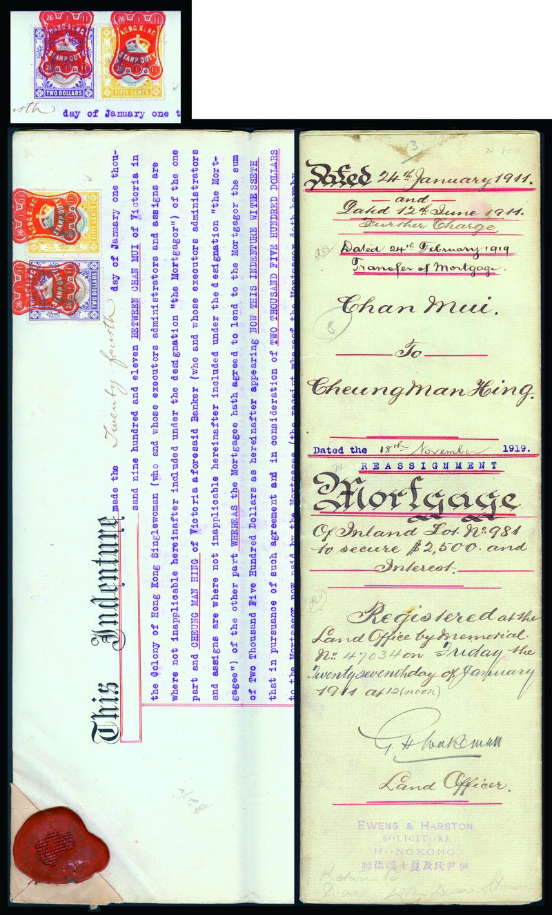 Indenture: 1911 (June 12) KEVII Revenues, bearing 15c, 50c, 75c(2), $2, $3 and $5, fine, scarce 75c usage.