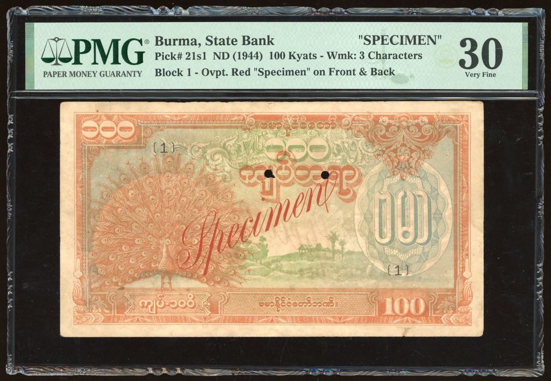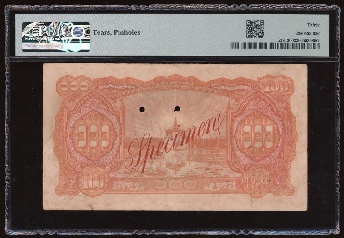 State Bank of Burma, specimen 100 kyats, ND (1944), block 1, no serial numbers, (Pick 21s1), PMG 30, tears, pinholes