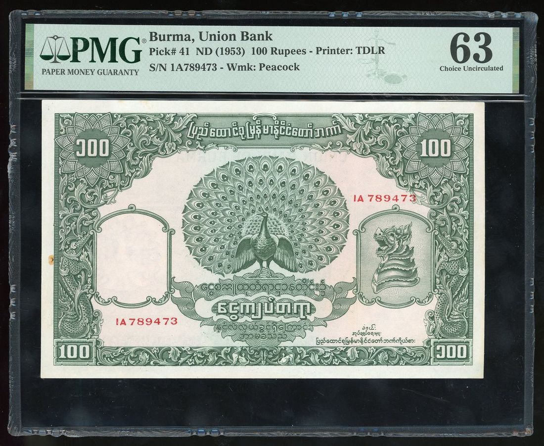 Union Bank of Burma, 100 kyat, ND (1953), serial number 1A789473, (Pick 41), PMG 63 Choice Uncirculated, minor rust. High grade type