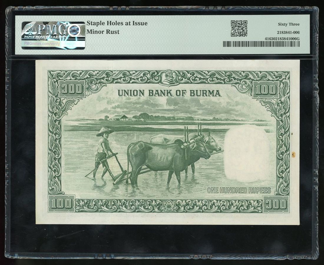 1953年緬甸100元, 編號 1A78947. PMG 63, 有輕微銹漬. 高分美品