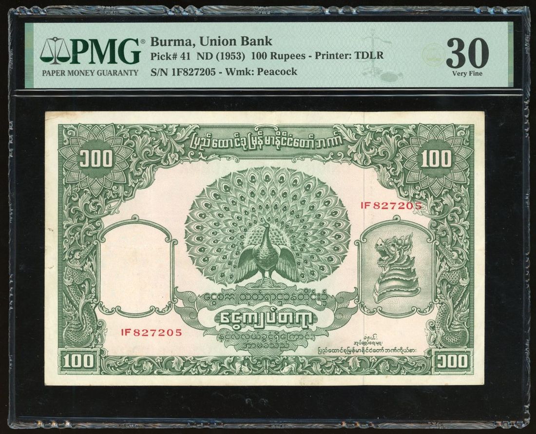 Union Bank of Burma, 100 rupees, ND (1953), serial number 1F827205, (Pick 41), PMG 30, staple holes at issue
