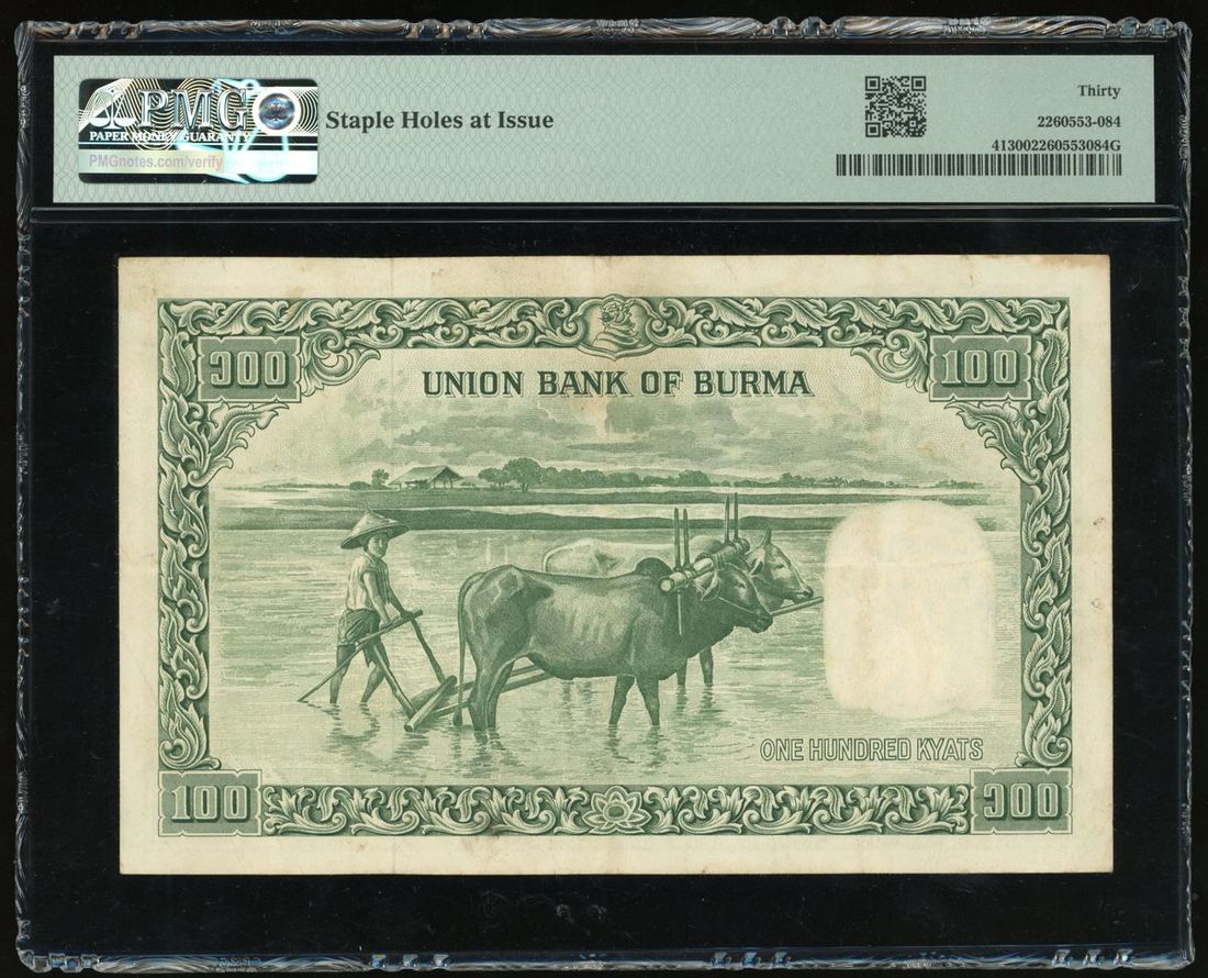 1953年緬甸100盧比, 編號 1F827205, PMG 30, 有釘孔