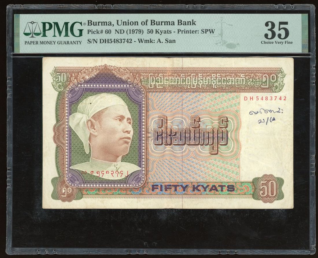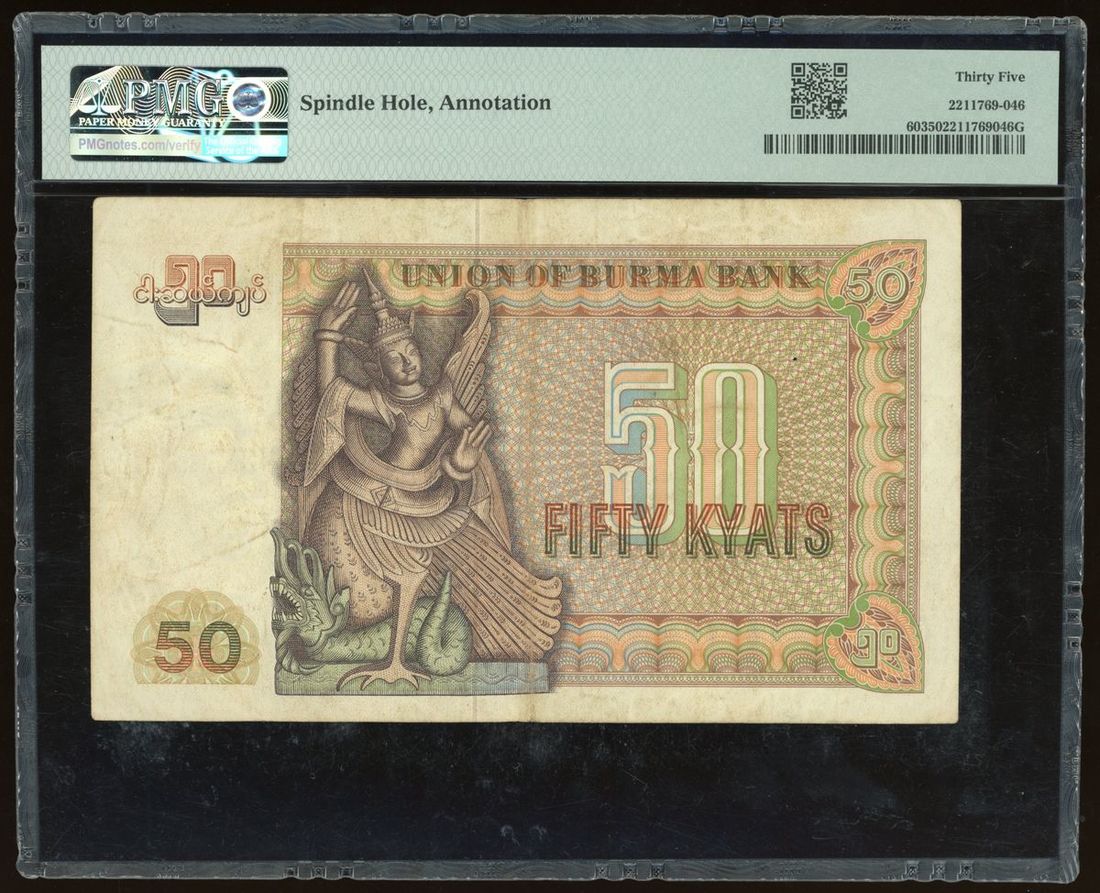 Union of Burma Bank, 50 kyats, ND (1979), serial number DH5483742, (Pick 60), PMG 35, spindle hole, annotation