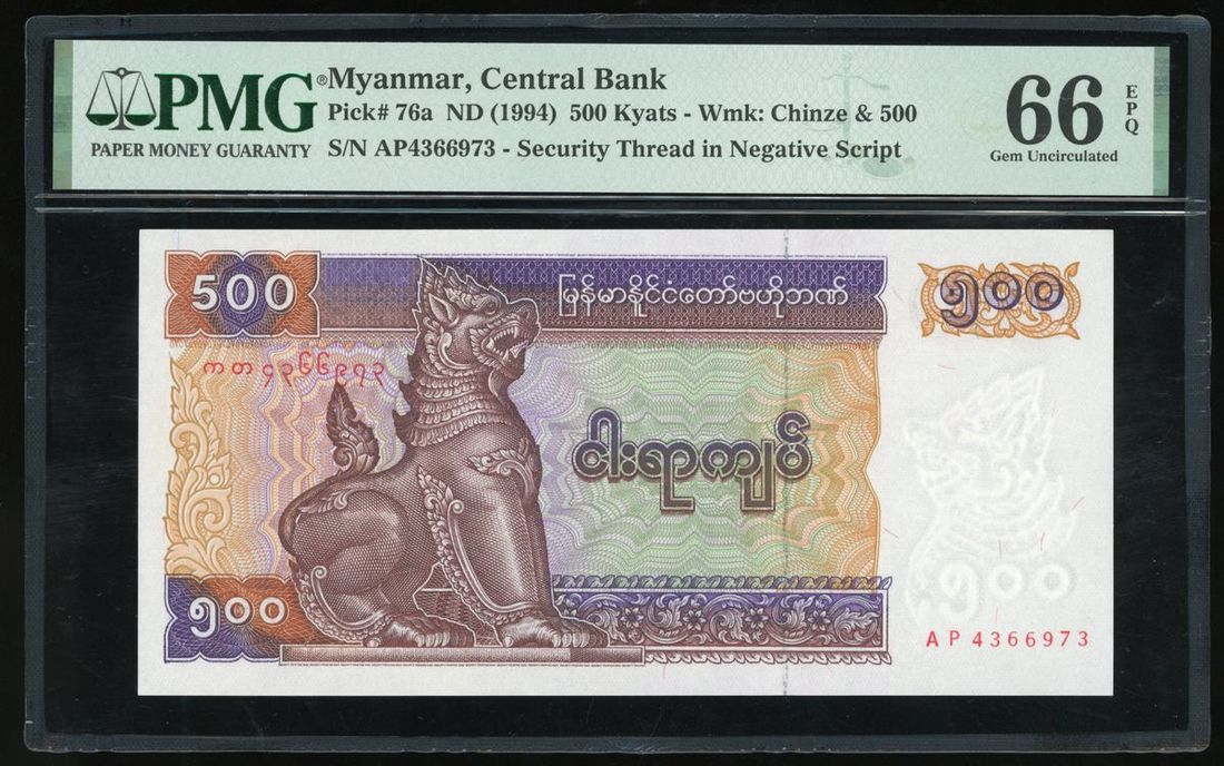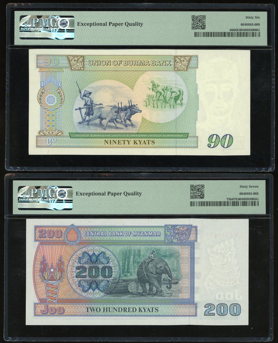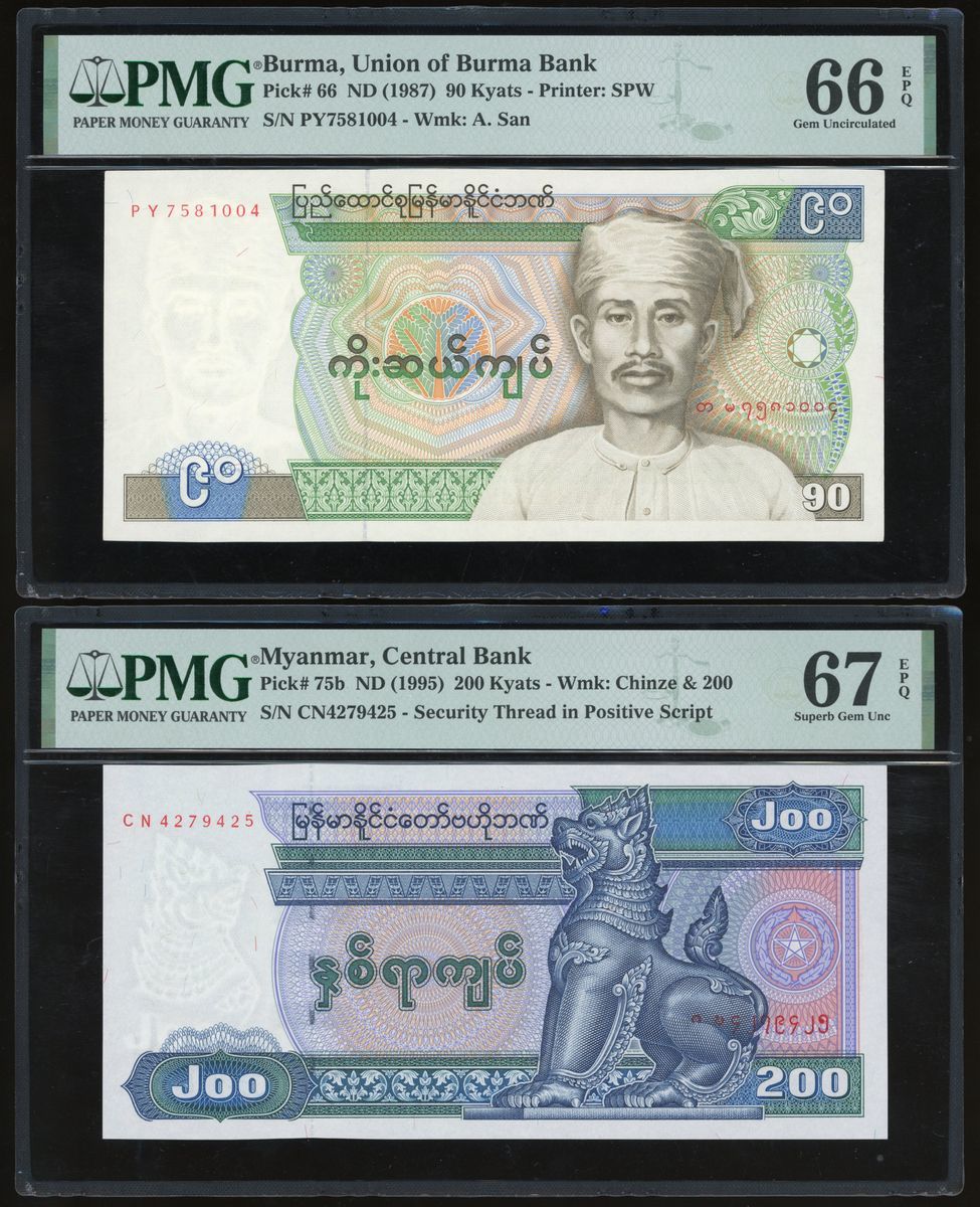 Burma / Myanmar, A Group o4 3 including, 90 Kyats, 200 Kyats, 500 Kyats, ND (1987), ND (1995), ND (1994), serial number PY7581004, CN4279425, AP4366973, (Pick 66, 75b, 76a), PMG 66EPQ Gem Uncirculated, 67EPQ, Superb Gem Uncirculated, 66EPQ Gem Uncirculated