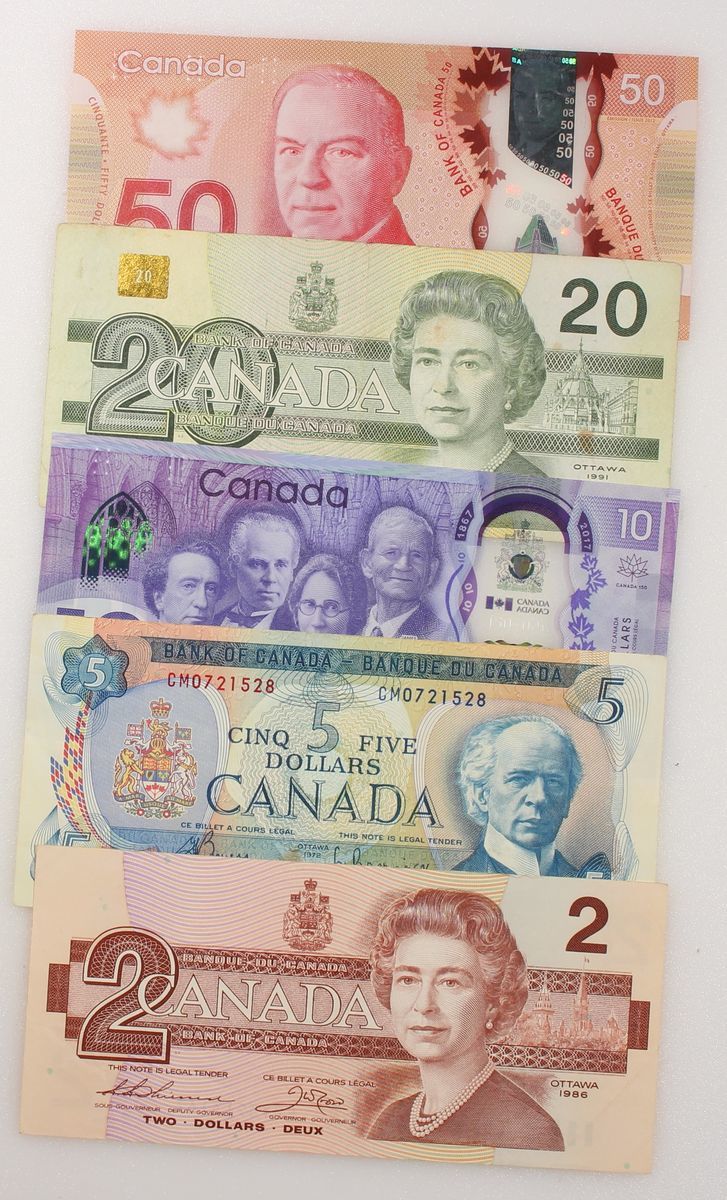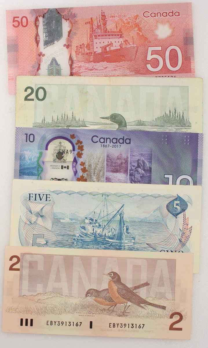 Canada, a group of 5 notes, including $5 1972, $2 1986, $20 1991, polymer $50 and commemorative $10 2017,