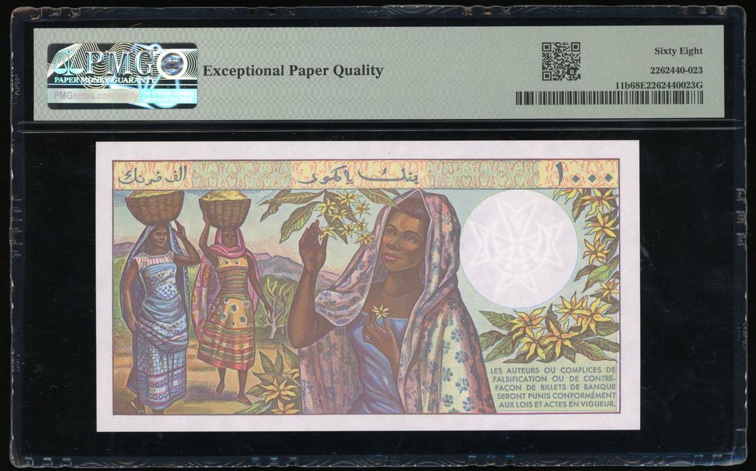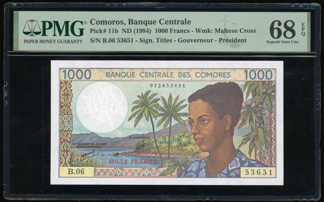 1984年科摩羅1000法郎, 編號 B.06 53651, PMG 68EPQ. 高分