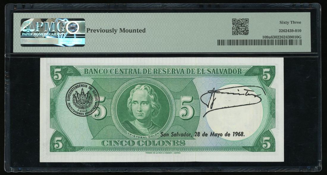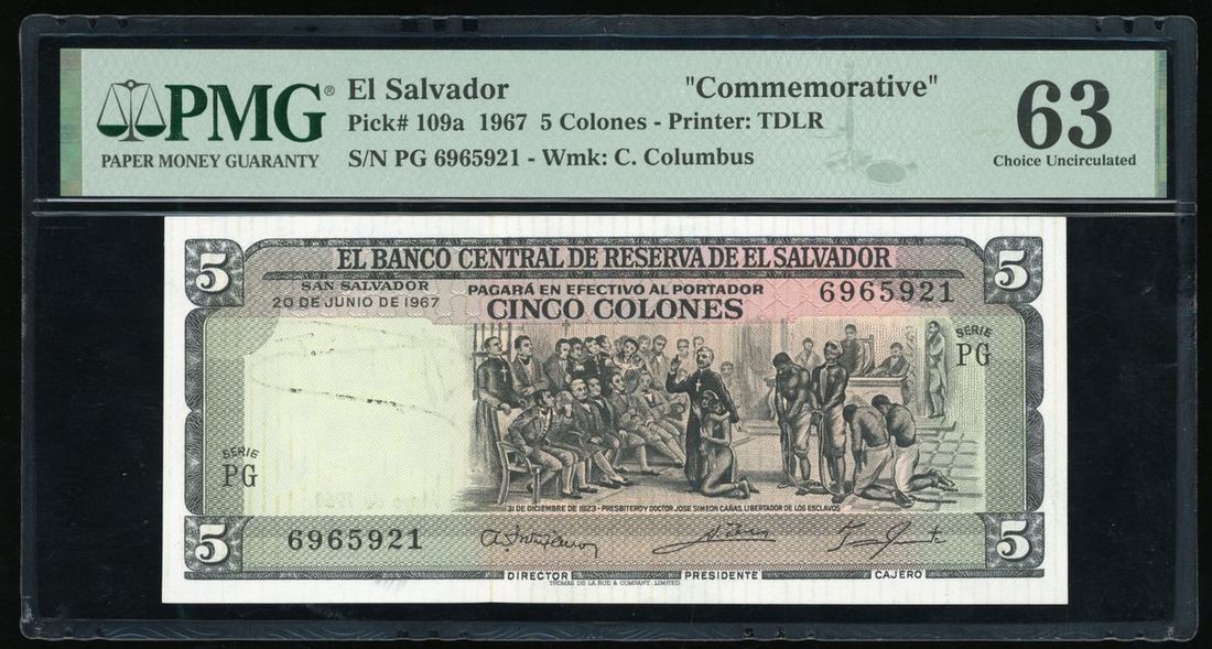 El Salvador, commemorative 5 colones, 1967, serial number 6965921, (Pick 109a), PMG 63, previously mounted.