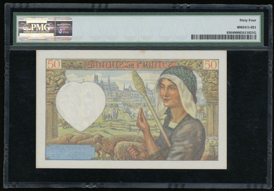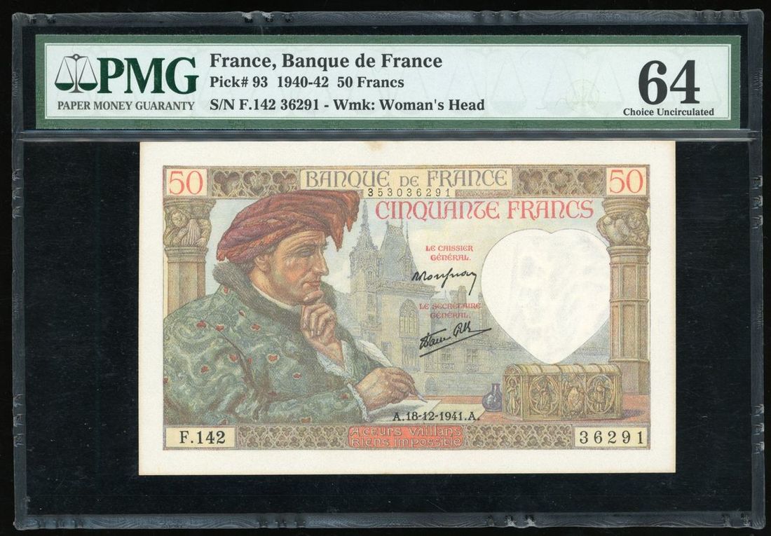 Banque de France, 50 francs, 1941, serial number F.142 36291, (Pick 93), PMG 64, choice uncirculated.