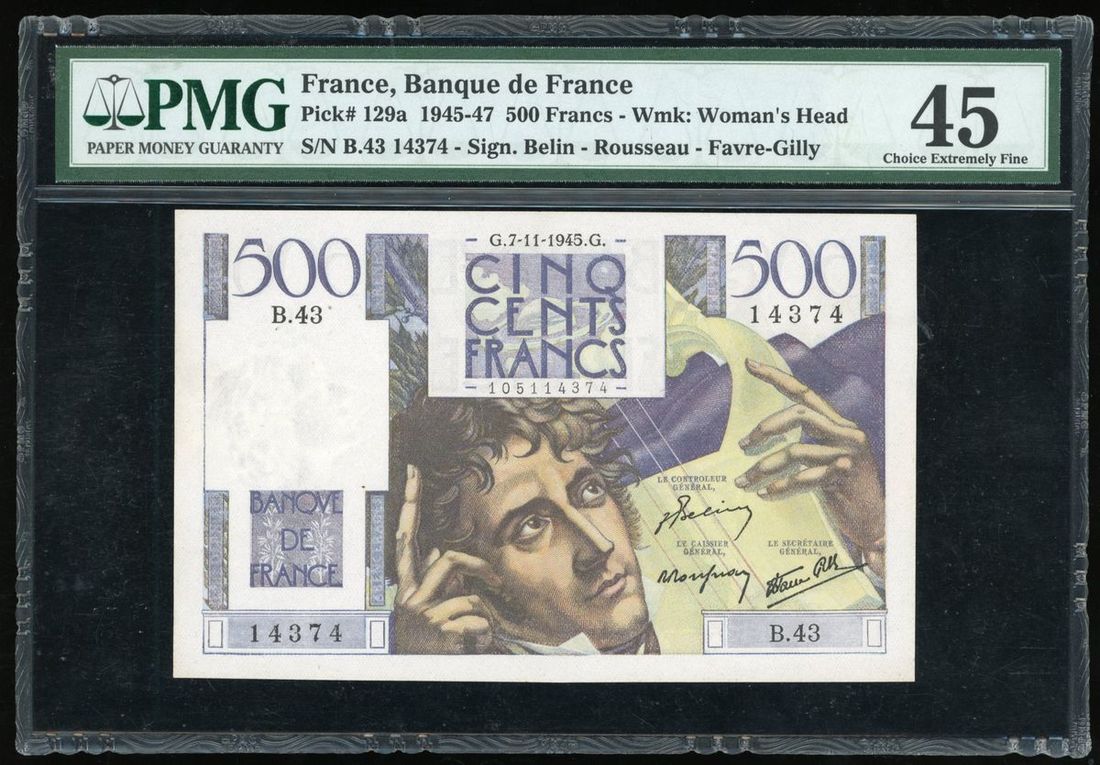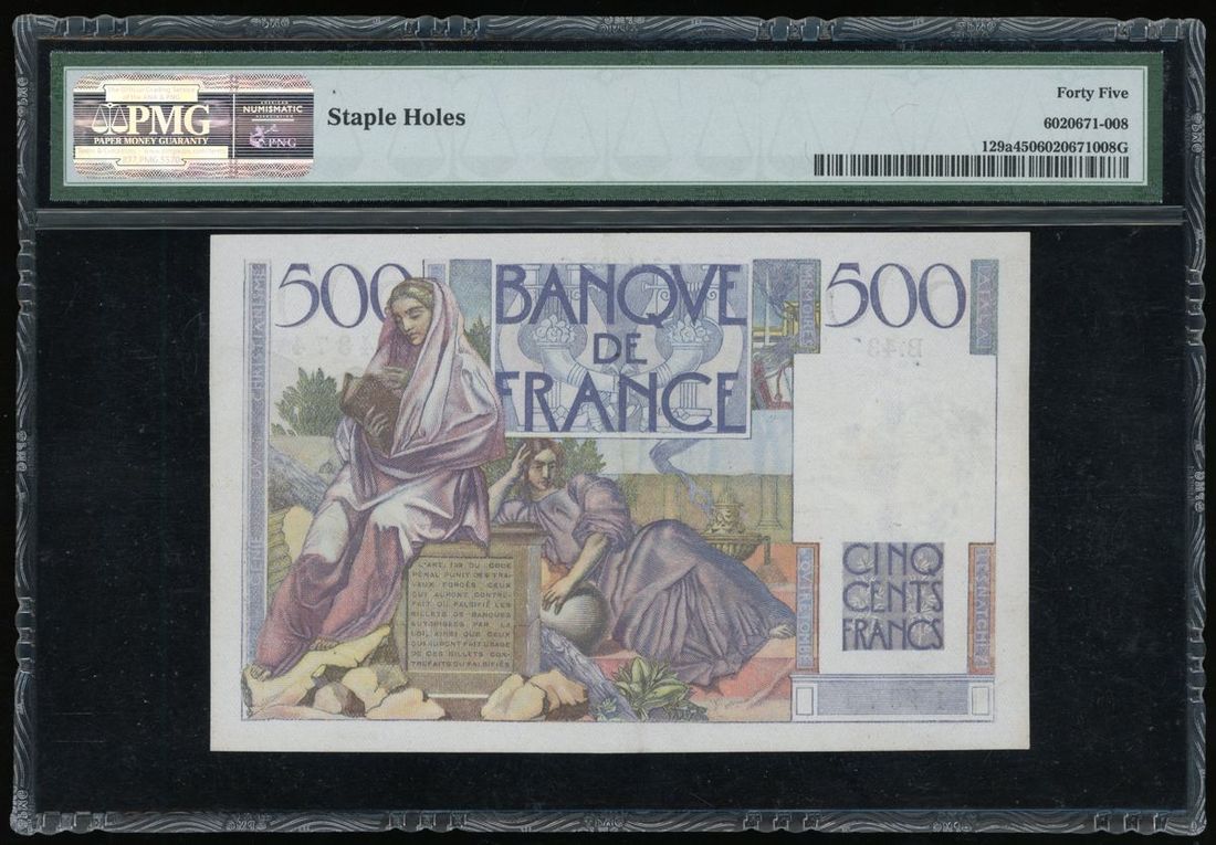 Banque de France, 500 francs, 1945, serial number B.43 14374, (Pick 129a), PMG 45, choice extremely fine, staple holes.