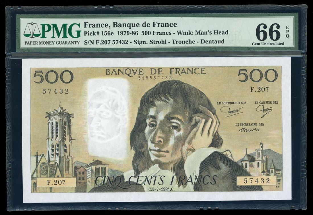 Banque de France, 500 francs, 5.7.1984, serial number F.207 57432, (Pick 156e), PMG 66EPQ