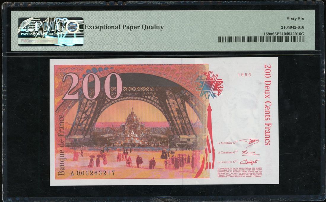 Banque de France, 200 francs, 1995, serial number A003263217, (Pick 159a), PMG 66EPQ Gem Uncirculated.