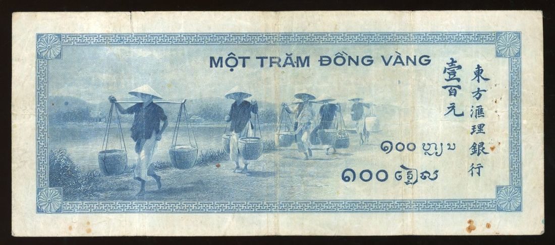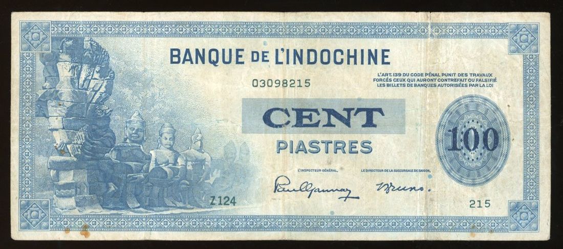 Banque de l'Indochine, French Indo China, 100 piastres, ND (1946), serial number Z124 215, (Pick 78), pinholes and split at margin, good fine