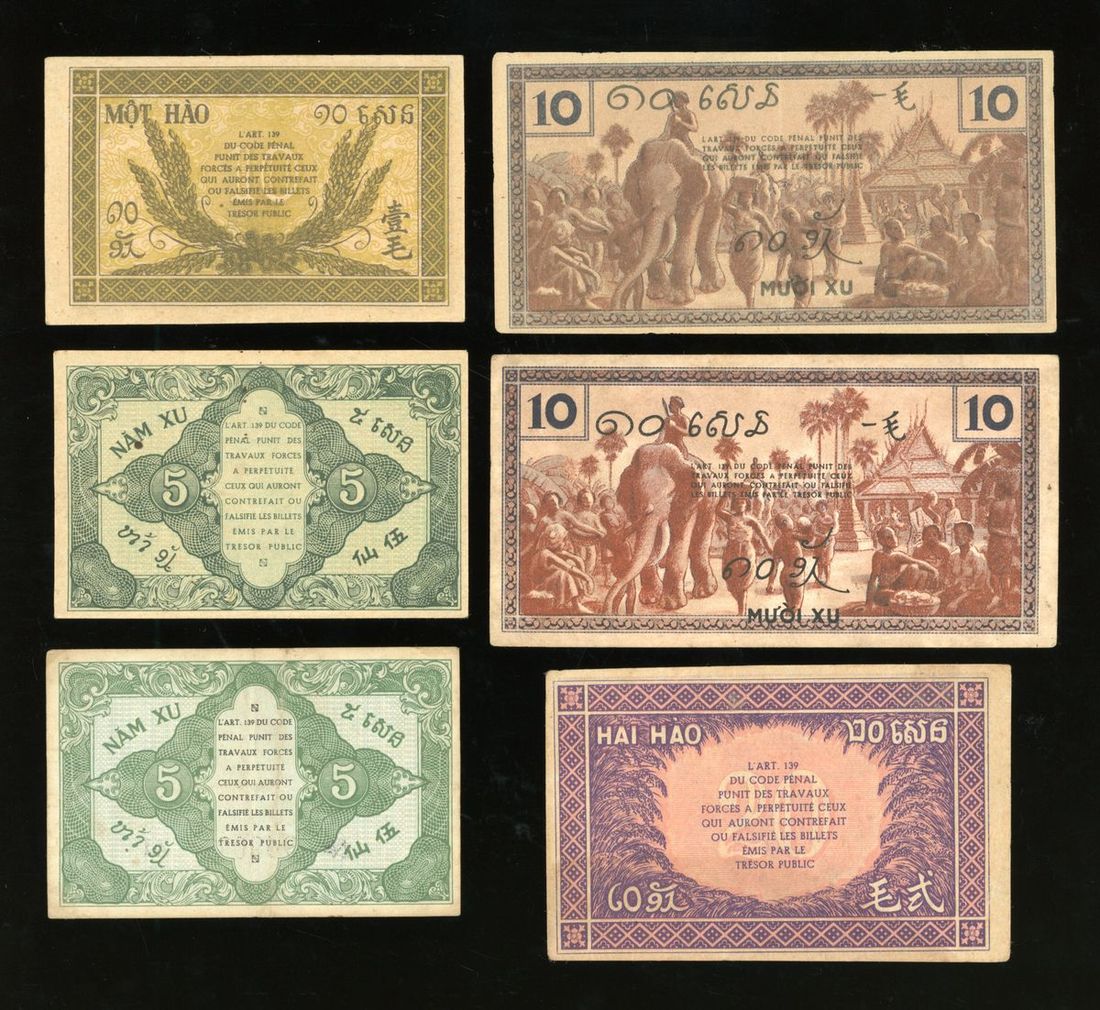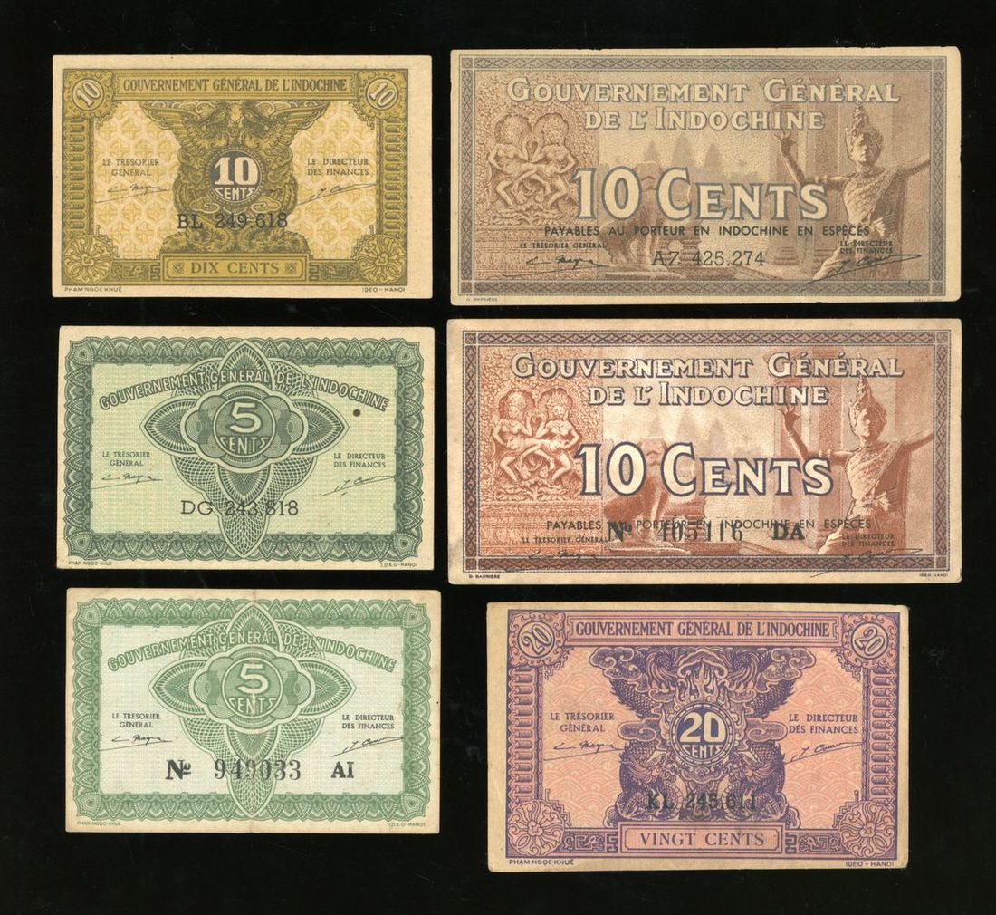 General Government of Indochina, a group of 6 notes, consists of 2x 5 cents, 1x 10 cents, 1x 20 cents, no date (1942-43), and 2x 10 cents, no date (1939), (Pick 88, 89, 90 and 85), very fine to extremely fine, with foxing, viewing recommended, sold as seen no return (6).