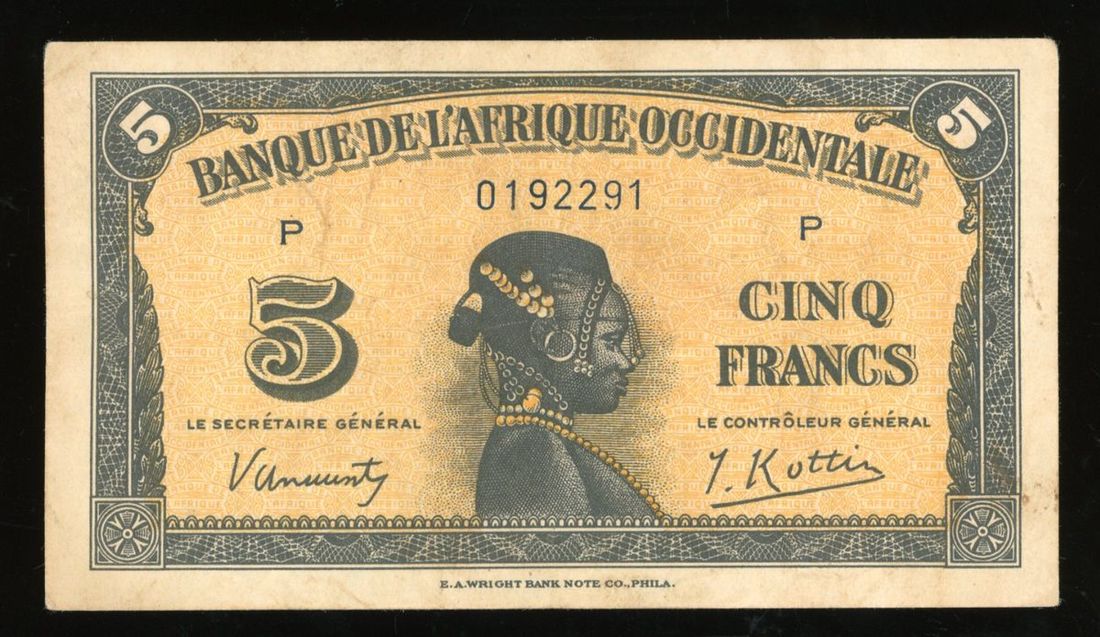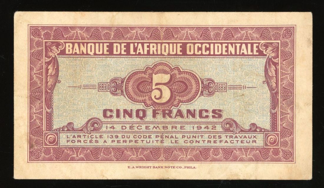 Banque de l'Afrique Occidentale, French West Africa, 5 francs , 14.12.1942, serial number P 0192291, (Pick 31), pressed, very fine
