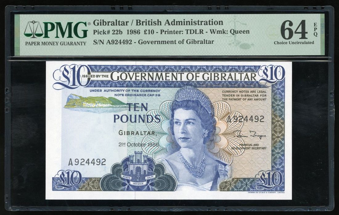 Government of Gibraltar, £10, 21.10.1986, serial number A924496, (Pick 22b), PMG 64EPQ Choice Uncirculated