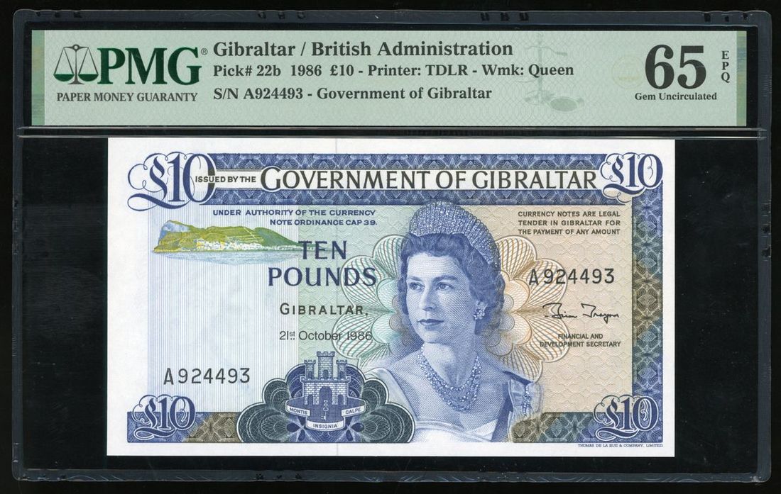 Government of Gibraltar, £10, 21.10.1986, serial number A924493, (Pick 22b), PMG 65EPQ Gem Uncirculated