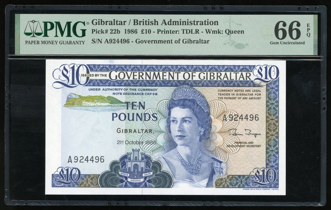 Government of Gibraltar, £10, 21.10.1986, serial number A924492, (Pick 22b), PMG 66EPQ Gem Uncirculated