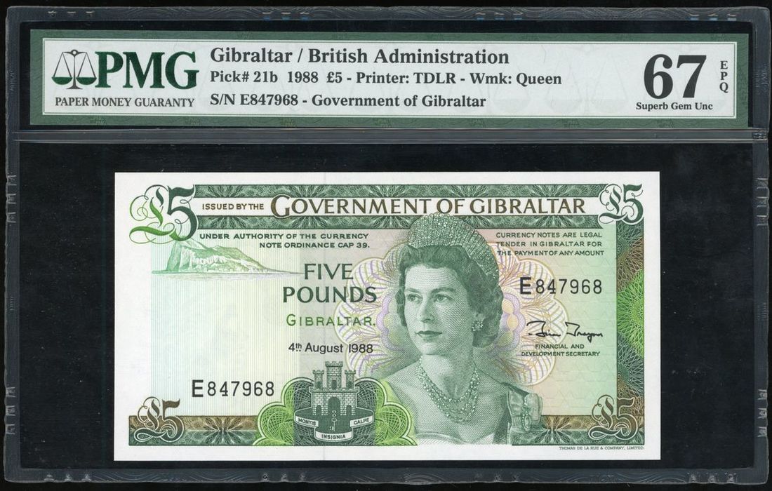 Government of Gibraltar, £5, 1988, serial number E847968, (Pick 21b), PMG 67EPQ Superb Gem Uncirculated.