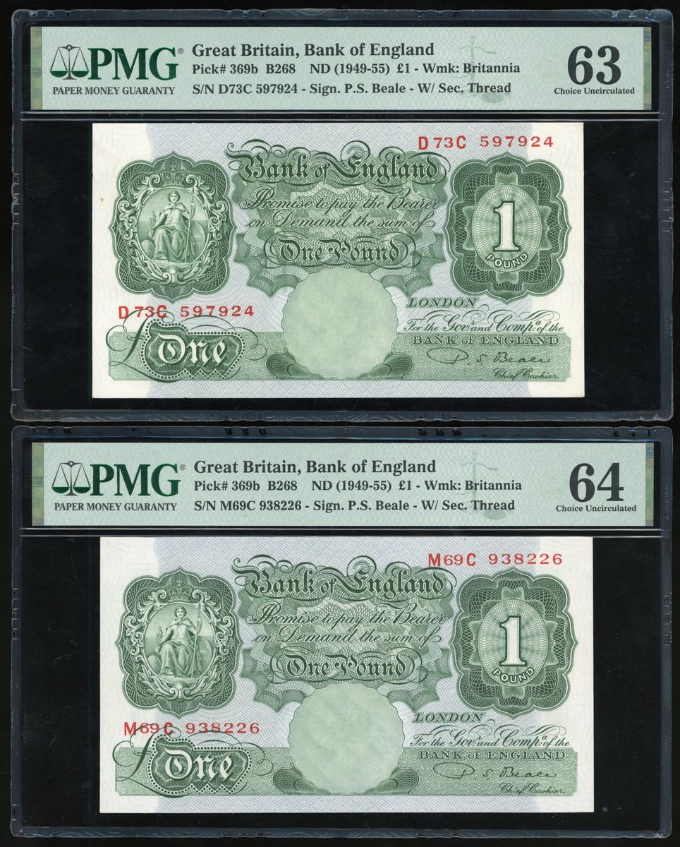 Bank of England, A pair of £1, ND (1949-55), serial number D73C597924, M69C938226, (Pick 369b), PMG 63 Choice Uncirculatd, 64 Choice Uncirculated