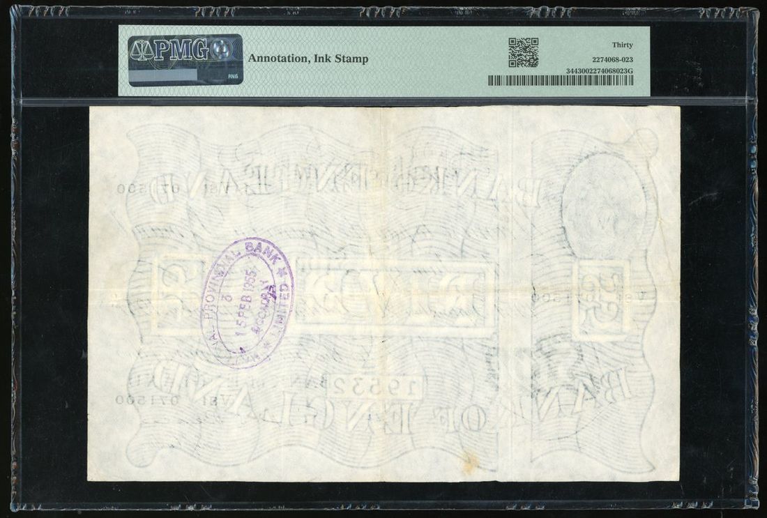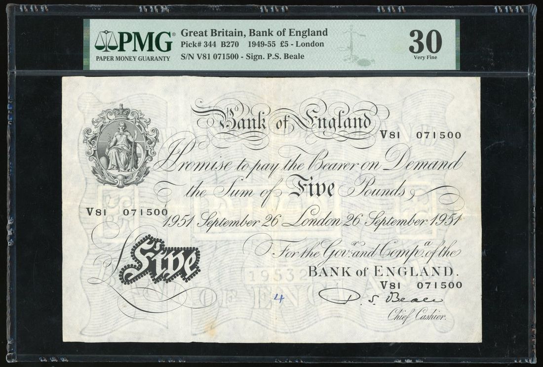 Bank of England, £5, 26.9.1951, serial number V81 071500, 'White Note', (Pick 344), PMG 30 very fine, annotation, ink stamp.