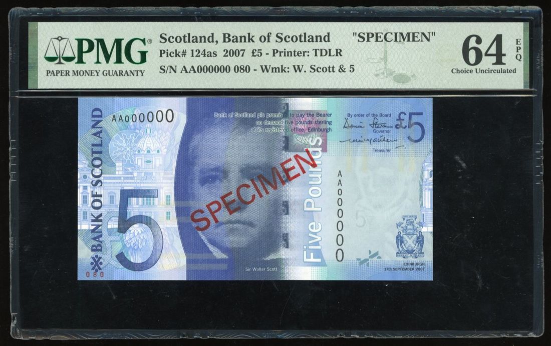 Bank of Scotland, specimen £5, 2007, serial number AA 000000, (Pick 124as), PMG 64EPQ