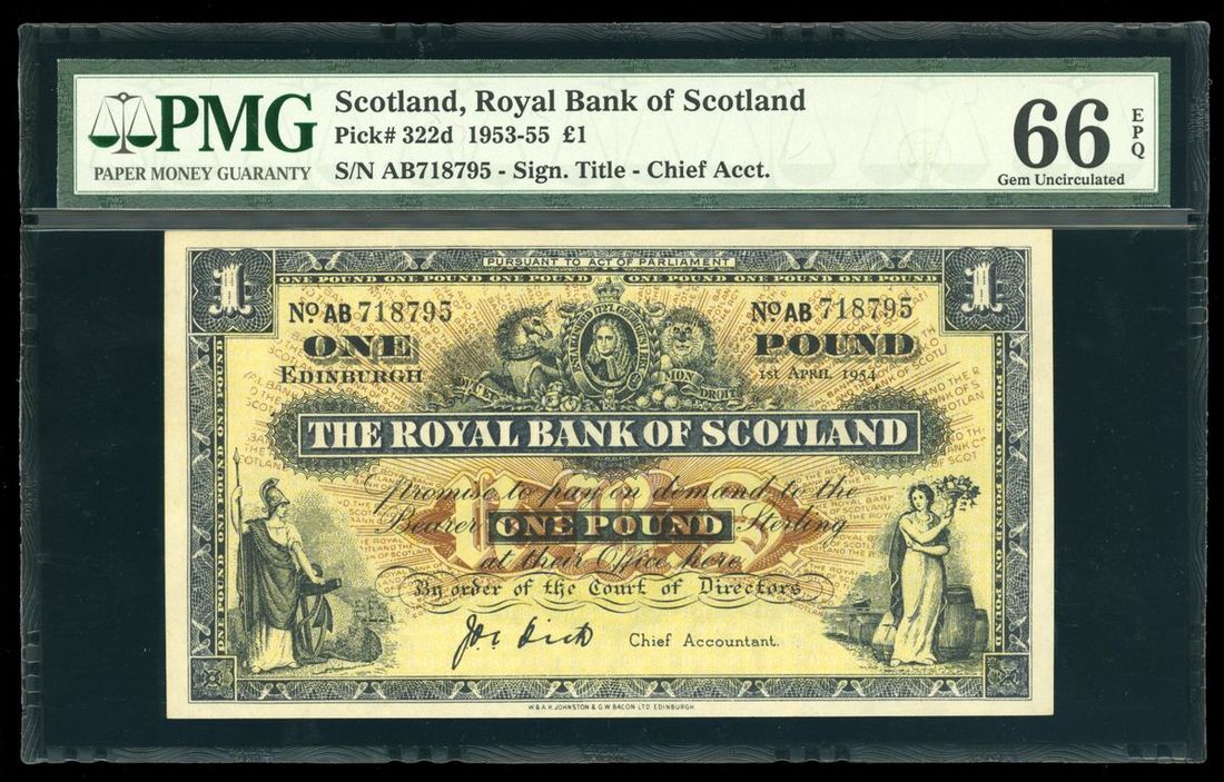 Royal Bank of Scotland, £1, 1st April 1954, serial number AB718795, (Pick 322d), PMG 66EPQ.
