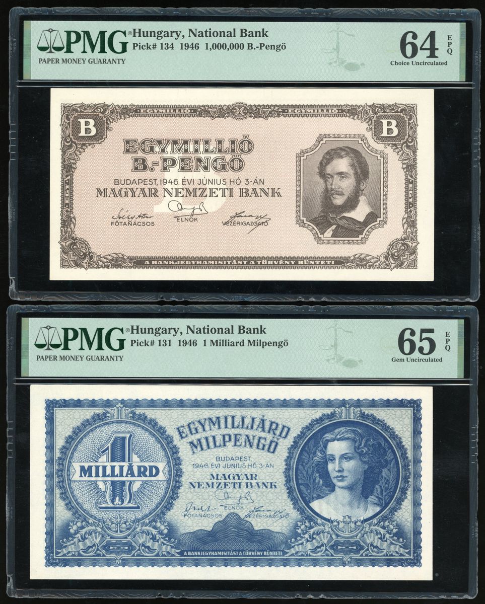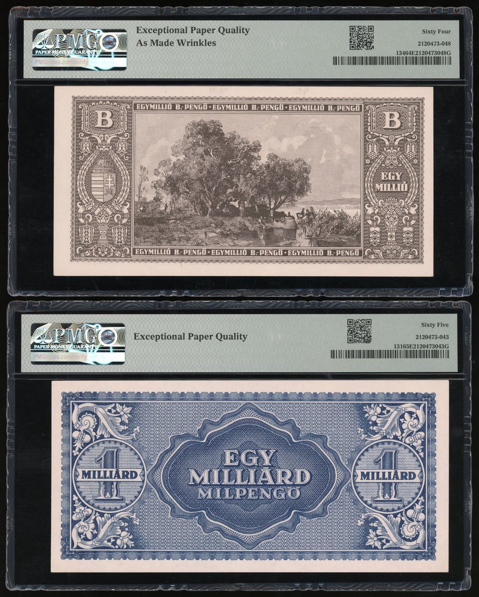Hungary, National Bank, a pair of 1 billion Milpengo and 1 million B.-Pengo, 1946, without serial number, (PIck 131 and 134), graded PMG 65EPQ and 64EPQ(As Made Wrinkles) respectively (2)